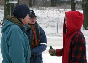 Il pleuvait et il y avait du vent. Les pratiquants sont arrivés au Consulat avant 10h. Ils se sont assis en silence et ont émis des pensées droites pour éliminer les facteurs pervers, en dépit du mauvais temps. Quelques uns expliquaient les faits aux passants, révélant les innombrables crimes commis par le PCC contre sa population. Beaucoup de gens qui passaient se sont arrêtés et assuré les pratiquants de leur soutien, les voitures qui passaient klaxonnaient en guise d'encouragement.