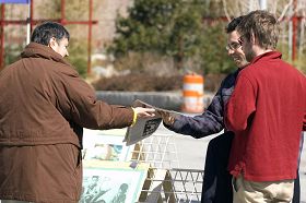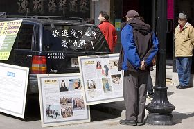 Des passants acceptent des copies des Neuf Commentaires sur le Parti communiste chinois |