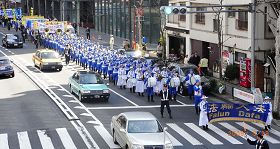 Le défilé a débuté au parc Ebisu et est allé jusqu’à un autre parc près de l’Ambassade de Chine. La fanfare de la Terre divine était à l’avant du défilé. La fanfare a joué « Falun Dafa est bon » et « La Loi rectifie le ciel et la terre. » Les participants du défilé tenaient également de nombreuses grandes photos et des banderoles, qui ont attiré les passants qui se sont arrêtés pour regarder. Les gens, les uns après les autres, ont pris des documents de clarification de la vérité qui dénoncent les atrocités du PCC.