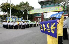 Les pratiquants ont tenu des banderoles où on lisait "Falun Dafa est bon " et "Authenticité-Compassion-Tolérance" devant la grille principale du Parc de Xu Fu à Seogwipo, Cheju, Corée. |