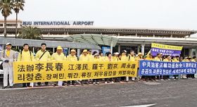 Pendant la visite de Li Changchun en Corée, les pratiquants coréens ont tenu des banderoles "condamnant la persécution" à l'aéroport de Cheju et demandé qu'un des principaux coupables dans la persécution du Falun Gong soit puni |