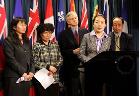 Press conference: (gauche a droite) Zhou Limin, porte-parole de l'Association Falun Dafa, Chen Guizhi, une pratiquante de Falun Dafa qui a été torturée en Chine, Yao Lian, David Kilgour, et Li Xun, président de l'Association Falun Dafa |