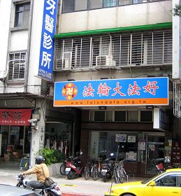 Le grand panneau proclamant "Falun Dafa est bon" sur la façade du cabinet dentaire |