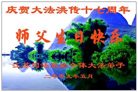 Les pratiquants du Système de sécurité publique et du système judiciaire de la province du Jiangsu souhaitent respectueusement un bon anniversaire au vénérable Maître ! Ils fêtent la Journée mondiale du Falun Dafa ! Ils chantent respectueusement les éloges pour le 17e anniversaire de la présentation du Falun Dafa au public et la Journée mondiale du Falun Dafa !