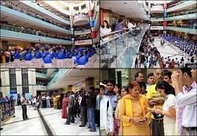 Les acheteurs dans le centre commercial Ambiance, le plus important de Delhi, se rassemblent du premier au cinquième étage pour écouter et applaudir la prestation |
