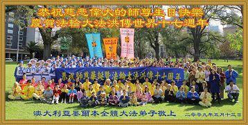 Les pratiquants de Falun Dafa de Melbourne, Australie souhaitent au vénérable Maître un bon anniversaire et célèbrent chaleureusement le 17e anniversaire de la présentation du Falun Dafa au public !
