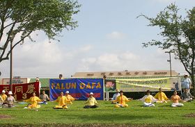 A 9 h 00, les pratiquants ont organisé une pratique en groupe boulevard Ballaire dans Chinatown. C’était une journée très ensoleillée. La musique des exercices du Falun Dafa qui résonnait dans Chinatown et les mouvements élégants des exercices des pratiquants formaient une scène spectaculaire.