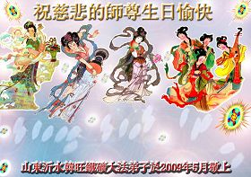 Une famille de 18 et trois pratiquants âgés d'un groupe d'étude de la Loi, de la ville de Chaocheng, canton de Xin, province du Shandong, souhaitent respectueusement un joyeux anniversaire au grand Maître vénéré !