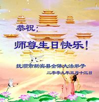 Les pratiquants du canton de Xinbin, ville de Fushun souhaitent respectueusement au Maître bienveillant et grandiose un joyeux anniversaire!