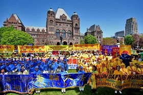 Le matin du 13 mai 2009, des pratiquants du Falun Gong ont organisé un grand rassemblement et un défilé devant l’édifice du Gouvernement provincial de l’Ontario à Queens Park. Cette journée est la Journée mondiale du Falun Dafa, le 17e anniversaire de la présentation du Falun Dafa au public et l’anniversaire du fondateur du Falun Gong.