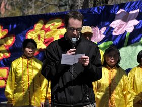 Le pratiquant Dane Crocker a dit dans son discours que les gens cherchent la vérité de l’univers et le sens de la vie depuis des milliers d’années. Maître Li a présenté au monde les principes universels de « Vérité – Compassion – Tolérance » pour la première fois. Même si les pratiquants sont persécutés en Chine, le Falun Dafa s’est propagé dans plus d’une centaine de pays. Plus de cent millions de personnes le pratiquent. Il a également remercié le peuple canadien pour son soutien.