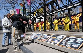 Monsieur Suea Wright regarde les affiches sur la propagation du Falun Gong dans le monde