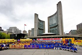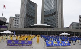 Le matin du 16 mai, les pratiquants de Falun Dafa du Canada et des États-Unis ont organisé un grand rassemblement Place Nathan Phillips devant l’hôtel de ville de Toronto. Les pratiquants ont présenté un programme varié pour célébrer le 17e anniversaire de la présentation du Falun Dafa au public. À ce jour, le Falun Dafa est pratiqué dans 114 pays et régions du monde. Un certain nombre d’élus canadiens et de représentants ont assisté au rassemblement et ont prononcé des discours de félicitations.