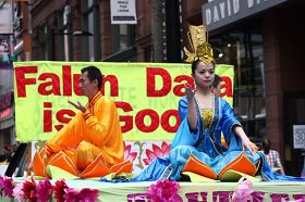 Les pratiquants de Falun Gong présentent les exercices sur un char décoré
