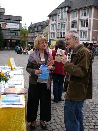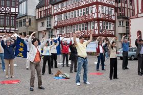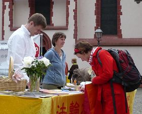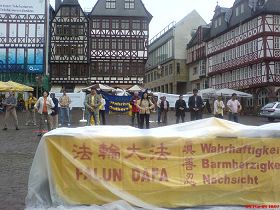 Afin de célébrer la Journée de Falun Dafa, qui est aussi l’anniversaire de leur Maître, les pratiquants de Falun Gong allemands ont tenu une série d’activités le 9 mai 2009 sur Romerberg Square à Frankfurt. Ils ont fait la démonstration des exercices du Falun Gong, révélé la persécution de personnes innocentes par le Parti communiste chinois et offert un spectacle de danses et de chansons composées par des pratiquants de Falun Gong. Ils ont aussi enseigné aux enfants comment confectionner des fleurs de lotus en papier et proposé des calligraphies avec les caractères chinois pour " Le monde a besoin d’Authenticité, Bienveillance, Tolérance " pour les occidentaux.