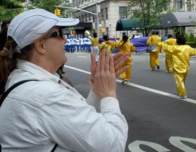 Irene, une résidente de Manhattan, a dit qu’elle aimait les principes de Vérité – Compassion – Tolérance. Elle a dit qu’elle sentait à quel point les pratiquants étaient paisibles. Elle a demandé le coût pour apprendre les exercices. Lorsque les pratiquants lui ont dit que toutes les activités du Falun Gong sont gratuites, elle a été surprise et elle a dit qu’elle voulait les apprendre.