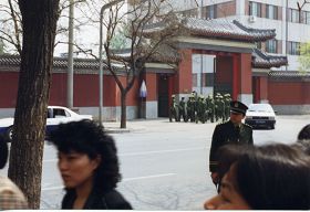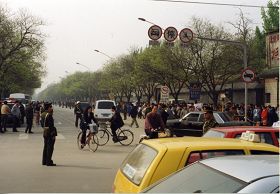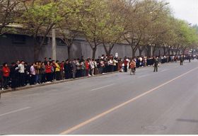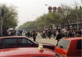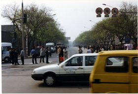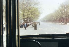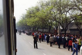 Cette photo a été prise le 25 avril 1999, de la fenêtre arrière du bus qui allait du nord vers le sud sur la rue Fuyou. Les pratiquants de Falun Gong sont à gauche de la photo, et le mur rouge à la droite est Zhongnanhai. La rue Fuyou se trouve entre les pratiquants et Zhongnanhai.