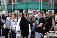 Dans l'après midi, les pratiquants ont mis en place une table sur Spitale Strasse, suspendu des banderoles, branché un haut parleur et commencé à diffuser la section "L'histoire de tuerie du Parti communiste chinois" des Neuf Commentaires sur le Parti communiste. Il y avait aussi une table pour une simulation d'opération par des médecins du PCC récoltant l'es organes de pratiquants de Falun Gong encore vivants.