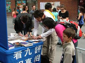 Beaucoup de gens ont été attirés en voyant la démonstration des exercices par les pratiquants, et certains d'entre eux se sont renseignés à propos du Falun Gong et de la persécution. Bien des gens ont signé les cartes postales qui font appel à la fin de la persécution.