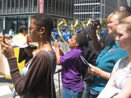L'effervescente cinquième avenue de Manhattan s'est réveillée le matin du 6 juin 2009 au son de la paisible musique des exercices du Falun Gong. D'immenses banderoles où on pouvait lire "Falun Dafa est grand" et "Vérité-Bienveillance-Tolérance" se déployaient l'une derrière l'autre. Les pratiquants en costume d'exercices dorés faisaient la démonstration des exercices, attirant l'attention de nombreux touristes et de la population locale.
