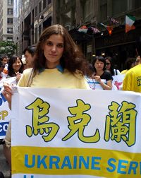 Tatina Skulkinia d'Ukraine pratique le Falun Gong depuis 2001. Elle a dit : « Depuis que je pratique, je suis devenue plus calme et compatissante. Dans le passé, j’avais un très mauvais caractère. Avant de pratiquer, je buvais beaucoup d’alcool assez souvent, vous savez, en Russie, beaucoup de jeunes sont comme ça. Après avoir appris le Falun Gong, je n’aimais plus boire, et la maladie qui s’était installée dans mon corps a disparu. Mon mari pratique également le Falun Gong, et cela a contribué grandement à améliorer notre vie familiale, parce qu’en suivant Vérité – Compassion – Tolérance, nous savons comment résoudre nos conflits. » Quand on lui a demandé pourquoi elle prenait part au défilé, Tatina a dit : « Je sais que le Falun Dafa est formidable, il a apporté toutes sortes d’avantages aux gens. Je suis très honorée d’être en mesure de me joindre au défilé, d’être avec autant de pratiquants du monde entier. C’est tellement merveilleux, je ne peux décrire avec des mots à quel point c’est formidable. »