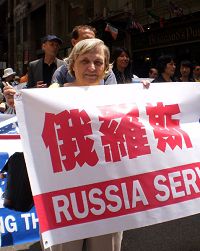 Zoya, en provenance de Moscou, est âgée de 70 ans et pratique le Falun Gong depuis sept ans. Elle a dit qu’elle avait cherché toute sa vie et quand elle a croisé le Falun Dafa, elle savait que c’était ce qu’elle cherchait. Elle a dit, après avoir commencé la pratique : « Ma famille est plus harmonieuse et la relation entre moi et ma belle –fille s’est améliorée. » Même si elle a 70 ans, Zoya travaille encore. Elle a déjà songé à prendre sa retraite pour passer plus de temps à la diffusion des faits et de la vérité du Falun Gong : cependant, son supérieur lui a demandé de continuer à travailler, même si elle travaille seulement en demi-journée. Comme Zoya est une pratiquante du Falun Gong et travaille, en conséquence, la compassion, son supérieur et ses collègues l’aiment tous beaucoup et ne veulent pas qu’elle quitte son travail. Tous les jours, Zoya apporte des banderoles devant le Consulat chinois à Moscou pour dénoncer la persécution du PCC. Au début, ses collègues faisaient des blagues à son sujet, mais en apprenant les faits et la vérité, ils l’ont tous beaucoup soutenue dans son action juste. Sur le thème de ce grand défilé à New York, Zoya a dit : « La persécution dure depuis dix ans. Je veux être avec les compagnons pratiquants du Falun Gong et ainsi condamner la persécution et les crimes brutaux du PCC. »