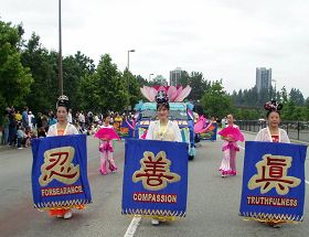 La Fanfare Tian Guo (terre divine) en costumes chinois traditionnels conduisait le défilé, les suivait un magnifique char décoré sur lequel des pratiquants présentaient les exercices du Falun Gong, puis la troupe de danse des Fées célestes et la troupe des tambours de taille. Tous étaient majestueux et ont reçu de chaleureux applaudissements tout au long du défilé. De nombreux spectateurs étaient originaires de Chine continentale très enthousiasmés de voir défiler un contingent composé principalement de chinois.