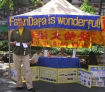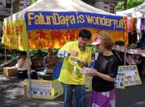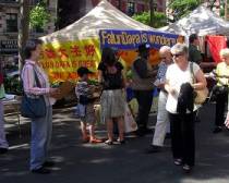 Le 15 juin 2009 était une fraîche journée d’été. Beaucoup de gens se sont retrouvés à la Foire de rue à Manhattan. Les pratiquants de Falun Dafa ont mis en place un stand à la foire. Quelques-uns ont fait la présentation des exercices et d’autres ont distribué des dépliants aux passants et leur ont parlé du Falun Dafa. Les visiteurs ont également appris la persécution brutale du Falun Dafa en Chine.