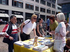 Une dame chinoise qui était en visite dans sa famille a dit aux pratiquants que la vie en Allemagne est de loin meilleure qu’en Chine, où de nombreux produits alimentaires contiennent des ingrédients toxiques. Elle a accepté avec plaisir une copie des Neuf commentaires sur le Parti communiste.