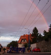 Puis le défilé a traversé la vieille ville, est passé par le château, et s'est dirigé vers le sommet d'une montagne. Un arc en ciel est apparu derrière la montagne. Marcher en grimpant en direction du sommet était fatiguant, le bel arc en ciel était une scène encourageante pour les membres de la fanfare. Ils sont finalement arrivés près de l'Ambassade chinoise et l'orchestre a joué là encore deux morceaux.