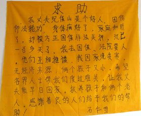 M. Ji Baoshan, un pratiquant de Falun Dafa du comté de Fangzheng dans la province du Heilongjiang a été illégalement arrêté il y a plus de trois mois Au moment de son arrestation, sa femme a été obligée de mendier pour nourrir son bébé de deux mois. Elle a écrit son histoire sur un morceau de tissu jaune et expliqué comment son époux a été arrêté parce qu’il pratique Falun Gong et aspire à être une bonne personne, comment leur maison a été pillée et comment ils ont perdu leur seul source de revenu, appelant à l'aide.