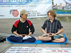 Un jeune allemand a été attiré par un pratiquant faisant la démonstration des mouvements des exercices. S'étant informé sur le Falun Gong, il a immédiatement demandé à apprendre les exercices. En cinq courtes minutes, il a pu s'asseoir en position de double lotus et appris le cinquième exercice. Il a dit à la fin "C'est une si bonne pratique, je dois continuer à apprendre."