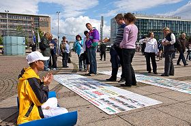 Cette place qui a été témoin du déclin historique du Parti communiste allemand a attiré de nombreux piétons à s'arrêter et lire les messages sur les banderoles et l'information sur les panneaux rendant compte de la terrible persécution des pratiquants de Falun Gong. Beaucoup se sont montrés concernés.