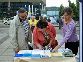 Lorsqu'une femme allemande avec ses deux enfants s'est approchée de la table d'information, avant même que les pratiquants aient fini de lui expliquer la situation, elle a pris un stylo et a signé le formulaire de pétition. Elle a dit "Je ne sais que trop bien comment est le Parti communiste. Vous n'avez pas besoin de me le dire, je sais que tout ce qui est écrit sur vos panneaux d'information est vrai, parce que j'ai vécu sous l’autorité communiste." La mère a emmené l'enfant regarder les photos exposées et lui a donné des explications pour chacune afin qu'elle ait une compréhension de l'autorité despotique du PCC et de ses crimes contre l'humanité.