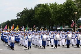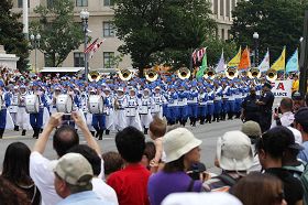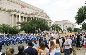 C'était la huitième fois que les pratiquants de Falun Gong sont invités à participer au défilé du Jour de l'Indépendance national. La participation de Falun Gong incluait la Fanfare de la Terre divine, un groupe de drapeau et un groupe de tambours de ceinture. C'était la plus grande participation de tout le défilé. La Fanfare de la Terre divine est comportée de 150 membres vêtus de brillants uniformes. Ils ont joué « Falun Dafa est bon, » « La Loi rectifie l'univers, » « Les tambours et les trompettes secouent le monde dans dix directions, » « La descente du Roi saint, » et « America the Beautiful. » Leur performance a fasciné des dizaines de milliers de spectateurs qui ont récompensé les participants avec de chauds applaudissements, des exclamations et des acclamations chaleureuses.