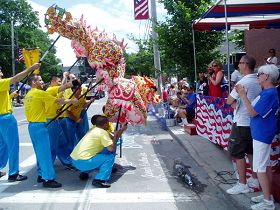 Le 4 juillet 2009, des pratiquants de Falun Dafa ont été invités pour la huitième fois à prendre part à la plus ancienne célébration du Jour de l’Indépendance aux Etats-Unis. La présence unique, composée d’un char et d’un groupe de danse du dragon, avec des caractéristiques orientales, a été vu par plus de 100 000 spectateurs enthousiastes, à Bristol, Rhode Island.