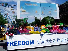 Le char du Falun Gong et le groupe de danse du dragon faisaient parti du défilé. Quatre pratiquants vêtus des costumes de l’antiquité chinoise étaient assis dans chacune des fleurs de lotus sur le char, et bougeaient avec élégance des éventails de soie aux couleurs lumineuses, sur la musique de « Falun Dafa est bon. » Un immense panneau sur le char transmettait le message aux spectateurs et l'on pouvait y lire « Falun Dafa - une pratique traditionnelle de cultivation personnelle pour améliorer le corps et l’esprit. Vérité – Compassion – Tolérance. »