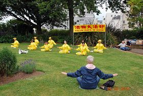 Vers midi, les pratiquants se sont rendus vers un terrain d'activité sur un port voisin, et ont suspendu une bannière où on pouvait lire "Falun Dafa est bon." En costumes d'exercices dorés, ils ont fait la démonstration des cinq séries d'exercices au son d'une jolie musique chinoise. Leur sérénité a attiré beaucoup de gens, qui se sont arrêtés pour regarder la démonstration. Un couple âgé a immédiatement commencé à apprendre les exercices. Les pratiquants ont distribué des imprimés d'information aux passants et à ceux qui se sont arrêtés regarder. L'information a été bien accueillie et certains ont souhaité s'informer davantage sur Falun Dafa.
