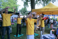 Les pratiquants ont planté une tente jaune sur la pelouse et disposé des photos retraçant la propagation du Falun Gong dans le monde, des livres de Falun Dafa, des posters présentant les exercices du Falun Gong et d'autres informations explicatives. A l’extérieur de la tente, quelques pratiquants faisaient la démonstration des exercices du Falun Gong et de nombreux touristes ont été attirés. Quelques pratiquants commentaient les exercices pour le public et révélaient la persécution en Chine.