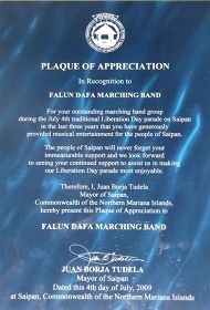 L e 10 juillet, le gouvernement de la ville de Saipan a présenté une plaque d'appréciation à l'ensemble Tian Guo des pratiquants de Falun Gong, pour leur remarquable prestation au Défilé du Jour de l'Indépendance.