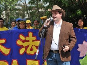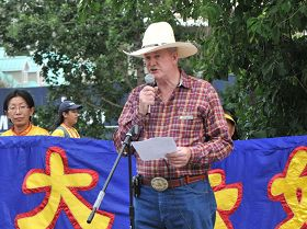 M. Jason Kenny a fait la remarque suivante au rassemblement, « Le Stampede de Calgary fête la culture occidentale, la culture du cowboy et du ranch qui est basée sur la profonde foi en la liberté personnelle et c'est ce que nous demandons pour les pratiquants de Falun Dafa en Chine et à travers le monde—voilà ce que nous célébrons ici au Canada. Je vous remercie de venir ici, je vous remercie pour votre participation à notre Stampede, je vous remercie de l'embellir et le rendre beaucoup plus coloré, et je vous remercie de toujours nous rappeler qu'il y a des victimes d'intolérance religieuse et politique à travers le monde.