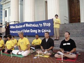 Les pratiquants de Falun Gong méditent devant le vieux tribunal, faisant un appel pour mettre fin à la persécution du Falun Gong en Chine par le PCC; |