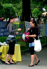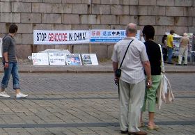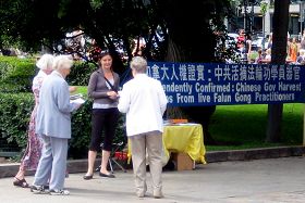 En voyant la banderole et l'information affichée, deux dames sont venues s'informer. Les pratiquants leur ont expliqué la persécution en Chine et leur ont dit que les photos étaient celles de pratiquants qui avaient été torturés à mort. Elles ont eu un choc. Les pratiquants leur dont dit que le but d'une telle activité était que davantage de gens puissent être au courant de la persécution en Chine. Les deux dames ont dit qu'elles soutenaient l'activité et offert leurs souhaits sincères que la persécution prenne fin le plus tôt possible.