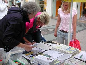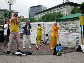 Le 18 juillet 2009, les pratiquants de Falun Gong de Nordrhein-Westphalie, en Allemagne, ont tenu un rassemblement Place Kennedy à Essen, et pacifiquement manifesté contre les dix ans de persécution brutale du Falun Gong par le Parti communiste (CCP).