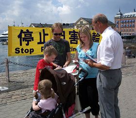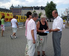 À Goteborg, une dame chinoise arrivée en Suède il y a un an a dit "Je pensais que Falun Gong devait être bon, sans quoi pourquoi autant d'occidentaux auraient ils entrepris la pratique ? Ils ne sont pas idiots. Pourquoi la Chine est elle le seul pays où la pratique est interdite ? Il y a quelque chose derrière. Je le sais à présent, en fait toute la propagande (du PCC) n'est que mensonges."