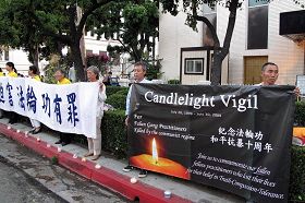 Les pratiquants de Falun Gong de Los Angeles ont organisé un rassemblement et une veillée aux chandelles devant le Consulat chinois dans la soirée du 20 juillet 2009, pour commémorer le 10e anniversaire de la résistance pacifique du Falun Gong et pour demander la fin de la persécution. Il y a dix ans, l’ancien dirigeant du PCC Jiang Zemin a annoncé son objectif d’éliminer le Falun Gong en trois mois. Il a échoué, mais ses efforts se sont intensifiés en une persécution brutale dans tout le pays.