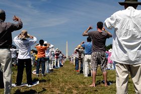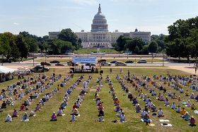 Plus de 700 pratiquants de Falun Gong du monde entier se sont rassemblés le 19 juillet 2009, sur la vaste pelouse du National Mall sur la colline du Capitole pour pratiquer leurs exercices ensemble.