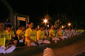 Les pratiquants ont déployé plusieurs banderoles sur lesquelles ont pouvait lire : "Falun Dafa est Bon" et "Dissoudre le PCC est le seul moyen de mettre fin à la persécution." La veillée aux chandelles a débuté dans la soirée à 19 h 30. En premier lieu, les pratiquants ont projeté des vidéos qui passaient en revue les évènements et activités majeurs de protestation contre la persécution ayant lieu en Chine continentale ces dix dernières années. Les pratiquants se sont assis en silence en mémoire de ceux qui sont morts de cette persécution. Ils ont également fait la démonstration des exercices du Falun Gong. Les activités se sont conclues avec quatre chansons composées et chantées par les pratiquants.