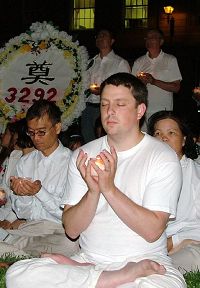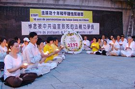Après le rassemblement, pratiquants et sympathisants ont tenu une veillée aux chandelles devant l'hôtel de ville, en mémoire de ceux qui ont été torturés à mort durant la persécution. Ils ont disposé les bougies de sorte à former le mot "Justice", appelant au coeur des gens pour arrêter la persécution.