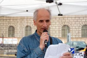 Dr Fei Liangying de la Fédération Démocratique de Chine est venu en voiture de Nuremberg afin de participer aux activités. Le Dr Fei et un représentant de l’Association des droits de l’homme ont tous les deux fait un discours sous la pluie afin de soutenir les efforts des pratiquants qui résistent à la persécution.
